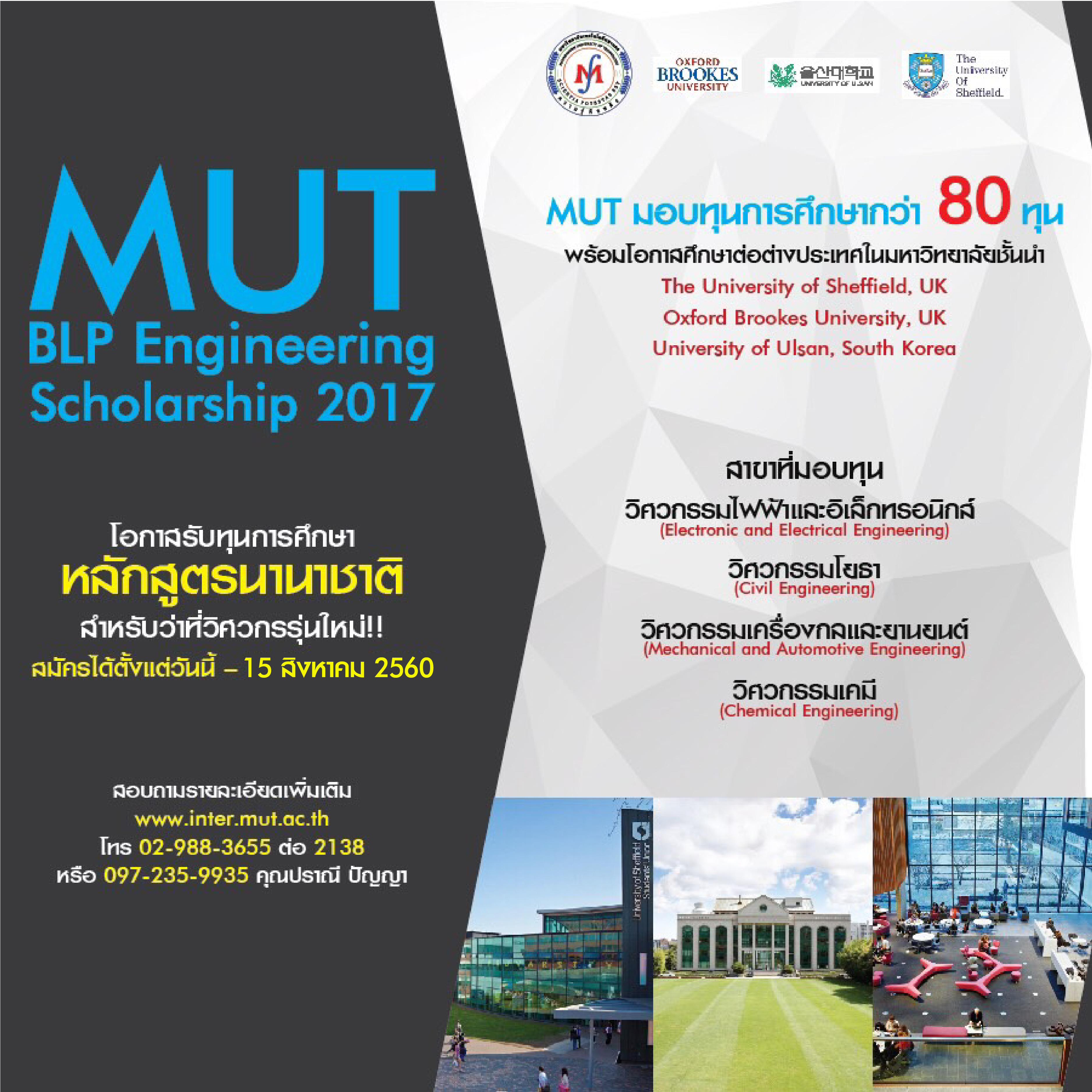 >> เงื่อนไขและเกณฑ์การมอบทุนการศึกษา MUT – BLP Engineering Scholarship 2017 |